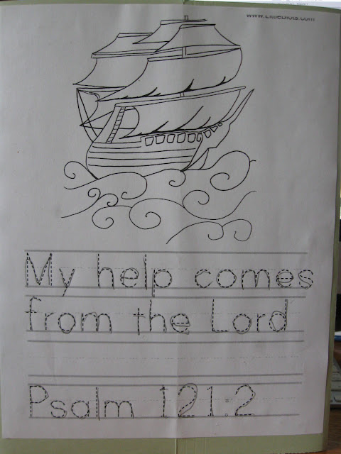 | #3's. The back cover had our memory verse for the week, Psalm 121:1-2 for the kids to write or trace. #1 wrote from memory, #2 did his as copywork, #3 traced a simpler version and #4 ignored his. |
